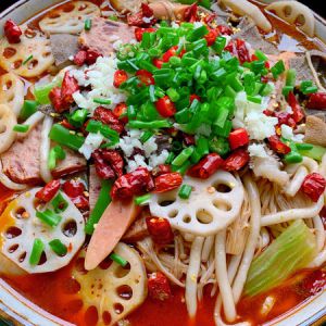 先放金针菇和午餐肉、火腿、鸭血等进去煮熟,再放入土豆粉、贡菜、藕片等蔬菜煮熟最后放入毛肚煮10秒连汤带菜倒入铺好油麦菜的盆子里。
