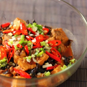 豆腐切方块,入沸水焯一下,捞出。猪肉末放生粉,米酒,黑椒粉和少量盐腌制30分钟。锅烧热,放少量油,肉末入锅,炒变色,捞出。蒜姜切末,干辣椒切段,红辣椒切细圈,葱切末。黑木耳切小片。