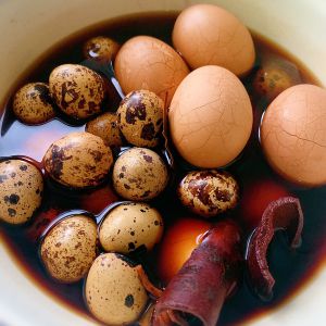 将捞出的鸡蛋、鹌鹑蛋逐个敲碎,别敲太碎哦~
