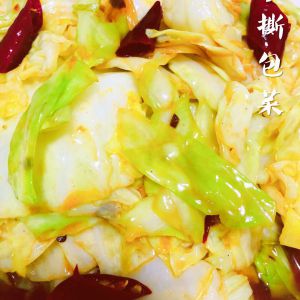 将沥干水份的包菜倒入锅中一起翻炒,全程大火