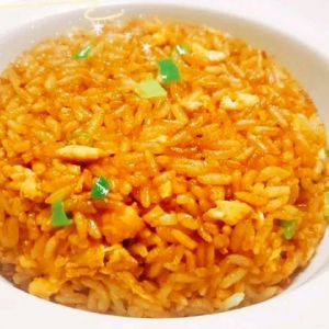 米饭一定要炒透了,不要图省事一次把料汁都加饭里,炒透了加葱花炒匀出锅