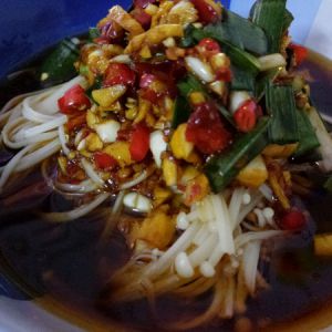 热油 烧到油开始冒烟时 倒到准备的酱料里 搅拌开来 再淋到金针菇上 滴一两滴香油 这道菜就完成啦 制作过程中没拍下来 将就着看啊