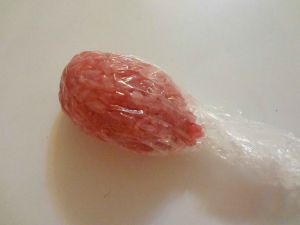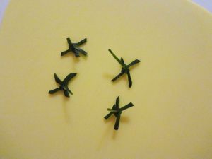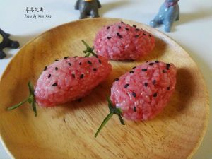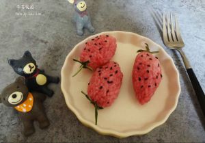 用黄瓜皮切成草莓蒂待用。在切好的草莓蒂中间叉一个小洞,然后切细小条黄瓜皮插入洞中,草莓蒂就这么做好啦。