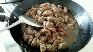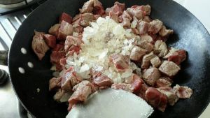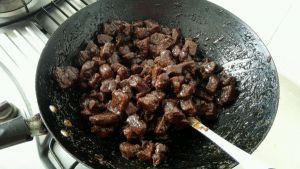 炒锅烧热,将牛肉倒入锅中,中火翻炒至肉块表面变色。