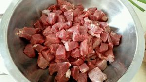 牛肉泡净血水,洗净,切成2cm见方的小块,也可以根据自己的喜好,切成条状或其他形状。