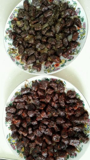 汤汁收干后,关火。将肉块盛入大平盘中,铺平,趁热洒上孜然粉或辣椒粉。放在阴凉通风处晾干,晾到一面表面较为干爽后,将肉块翻面,装到干净的盘子中,把肉块另一面也洒上孜然粉或辣椒粉。继续晾干。