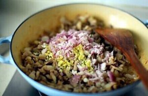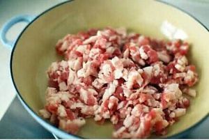 锅热无需加油放肉丁煸炒,炒到肉丁出油,加洋葱碎,蒜姜末,煸炒几分钟