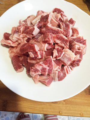 牛肉洗净切块,入冷水锅加热焯出血水,撇去浮沫捞出。