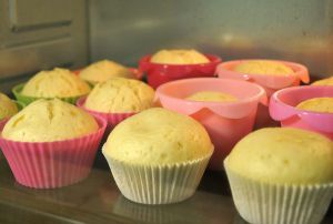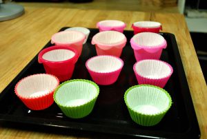 先将12个纸杯分别摆放好,为了美观,我选了不同开口的烘焙模具,因为其中有些比较大,可以多盛些面糊,所以放不到12个