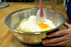 添加油、水、鸡蛋,先用刮刀搅拌几个,搅拌均匀。这个时候可以同时将烤箱预热一下,顶/底热180度,用上下双管加热,差不多3分钟即可,太久了会太热,再烤蛋糕时容易糊