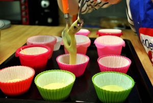 用两个勺子将面糊分别放入各个烘焙杯子中,注意不要放得太满哦,不然在烤地过程中肯定会溢出来的,而且形状也会不好看