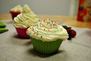 冷却好松饼后,将奶油挤到一个个松饼上,注意哦,如果在打发奶油的过程中使用了奶油定型粉,那么奶油定型的时候将会长一些,但室温较高的情况下,还是会化的。还可以在奶油上撒一些装饰糖