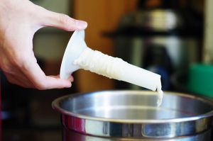 将清洗干净的猪肠衣(羊肠衣也可以)套到灌香肠用的漏斗上,全部套好之后,在肠衣的最末端打结;