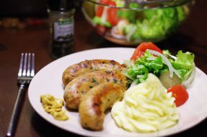 将煎好的韭菜香肠装盘,搭配色拉和土豆泥,用芥末酱调味。一份洋溢着春天气息和色彩的美食就等着你享用了!