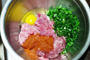 将1袋(12g)德式韭菜香肠调料和1斤猪肉馅以及50g的韭菜末混合,打入一只鸡蛋,搅拌至肉馅上劲;
