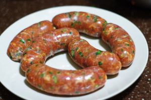 往漏斗中塞入调好的肉馅,待肉馅全部塞进肠衣后,在肠衣的首端打结。将灌好的香肠每隔10公分左右扭转若干圈,使香肠分成小段;