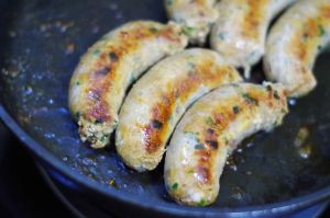 在煎锅中刷一层薄油,将香肠剪开,放入煎锅, 煎至两面金黄肉馅熟透即可;