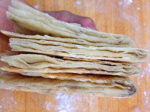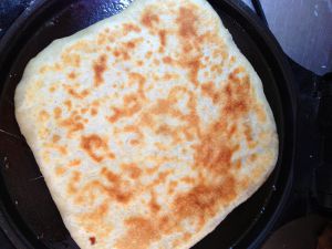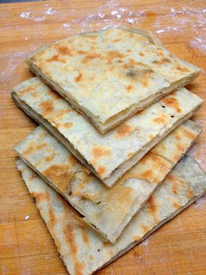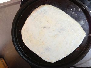 把卷成团的面擀成面饼放入电饼铛中烙制