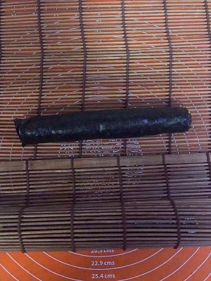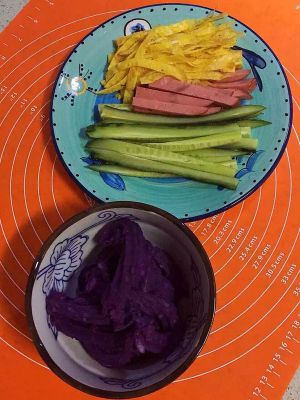 紫薯大米泥平铺在海苔上,黄瓜火腿鸡蛋放在中间码好,开始卷