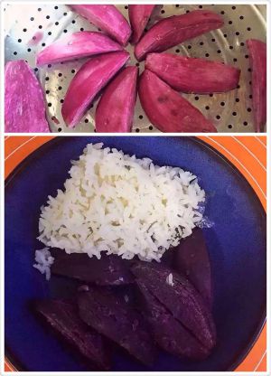 紫薯上笼屉蒸熟,米饭蒸熟