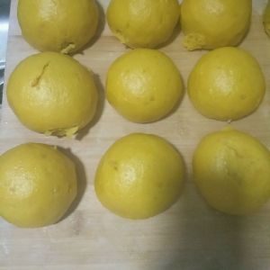 将安琪发孝粉兑温水搅开,倒入面里,再将南瓜放进面中,和面。