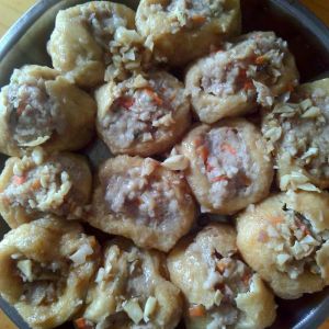 空碗里放入酱油,盐,糖,蚝油,蒜粒和小两勺开水,搅拌。在锅熄火后,淋在油豆腐上面。