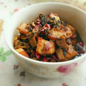 3.加入老抽上色,倒入香料炒香,再加入梅干菜翻炒均匀,加入适量水煮开调味,装入碗中,有电压锅现在压18分钟,到了时间出锅即可。