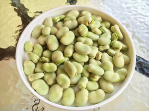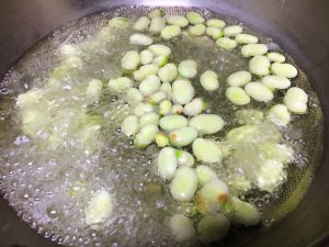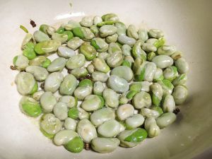 煮好的胡豆洗净控水,入油锅翻炒至皮衣暴裂;