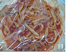将调好的料汁,倒入鱿鱼圈中,充分混匀。