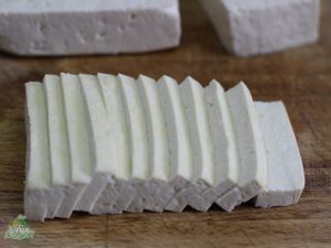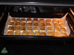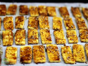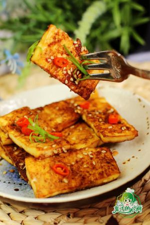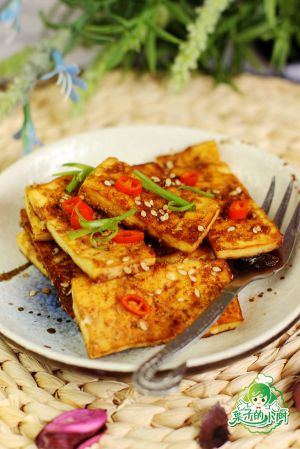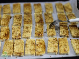 豆腐摆放到铺好油纸的烤盘上,表面刷上调味汁,稍微多刷一点,然后用叉子在豆腐上挨着插一些小孔,使豆腐入味。