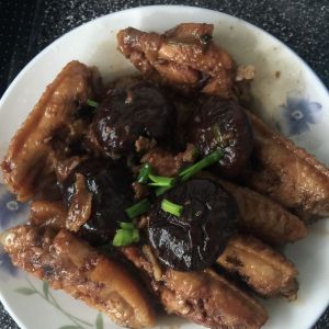 泡发干香菇备用,捞起鸡翅,晾干,锅里加油,将鸡翅一一煎至金黄,加可乐漫过鸡翅,加生抽,水,中火15分钟后加盐小煮5分钟关火起锅。