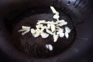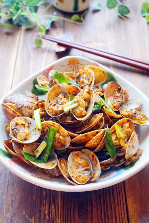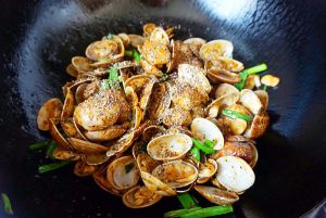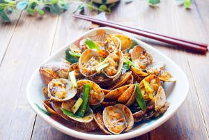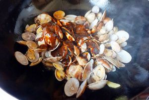一定是控干水份的花蛤下锅翻炒,不然会烹油滴。