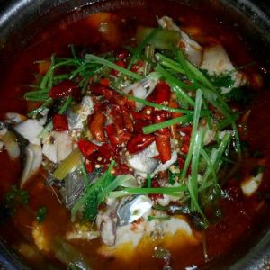煮熟之后,把鱼倒入盆里。洗锅烧热油,在鱼表面撒花椒,干辣椒,把热油淋上去就大功告成了。