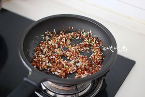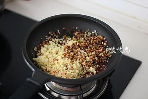 平底锅内刷饱饱的一层花生油,锅烧热后下切好的腊肉丁煸炒出肥油,下葱姜末炒出香味。