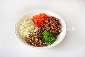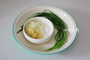 葱段、姜同样切末,蒜苗叶洗净用热水烫一下一会扎福袋用。