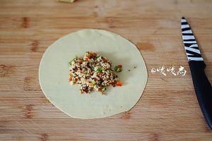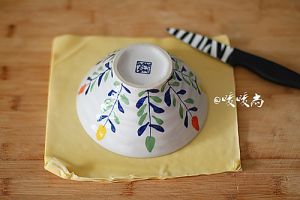 千张铺开,选一个合适大小的碗做模具,用刀将千张切割成圆形。