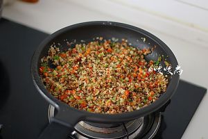 将冬笋、香菇(提前泡发)、腊肉(提前用热水煮20分钟晾凉)、青红椒(提前洗净)切小丁。