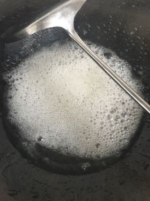 将白糖和水在锅中煮、放入一点盐一起煮成糊状、