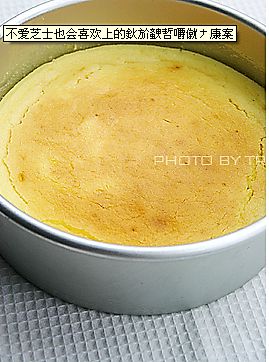 入模后烤盘上注入热水(如果是活底模的话请用锡纸包好,或者用蛋糕架架在放有热水的烤盘上,或者欢欢的方法,用一个皮萨圆模子装上活底模子,然后放在烤盘里面~仔细看图可以看出来!)