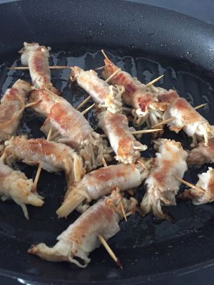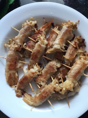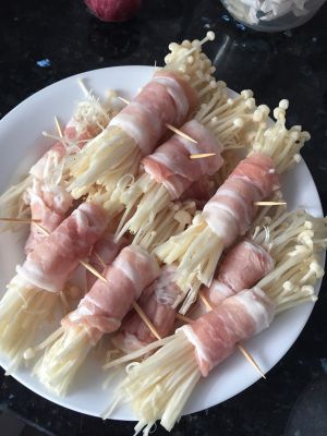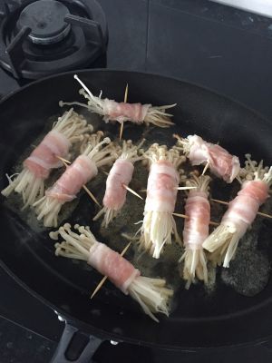 培根卷铺平,然后放上金针菇,卷起来后拿牙签固定,(前面的图忘记拍了哈…)