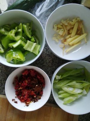 八角桂皮花椒辣椒洗净,葱姜切块,青椒大葱切段,前期准备完成