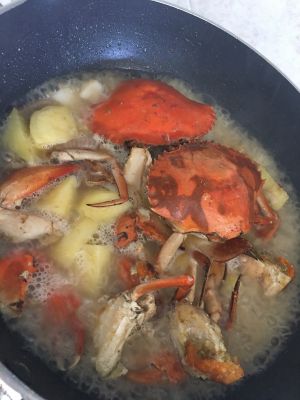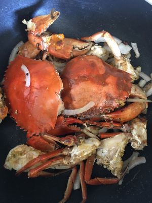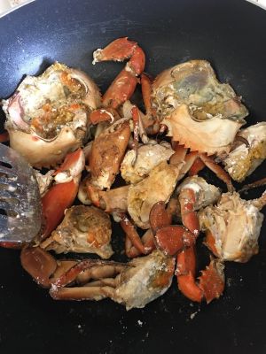 第六步:然后锅中放入裹好淀粉的青蟹翻炒