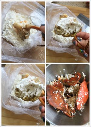 第四步:蒸好的蟹用淀粉裹住,一会儿下锅炒不会掉肉。