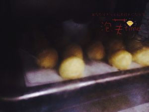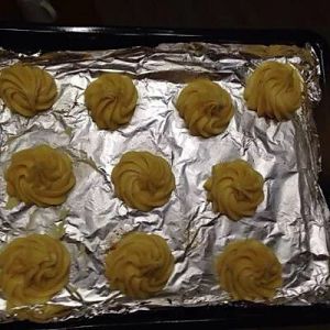 选择大菊花嘴的裱花嘴挤出适当的大小。注意距离不要太近,泡芙在烘烤的过程中会膨胀。
