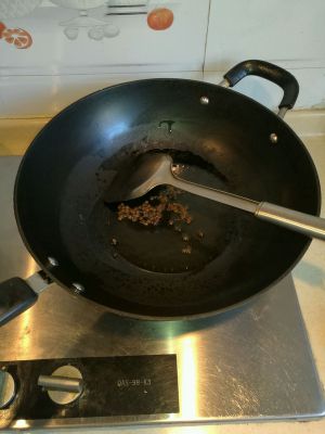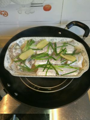 拣起鱼盆中姜片及蒜叶,保留蒸魚汁水待用。起油锅炼花椒油。