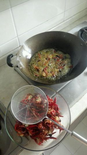 锅里倒油,油温沸腾后将小龙虾分批过油炸一下,炸的变色即可。