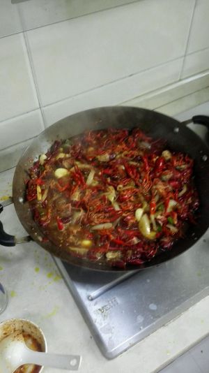 用炸虾后的油,将油温升起后倒入混合均匀的豆瓣酱等炒制出香味后倒入干辣椒,花椒生姜等继续大火炒制几分钟。