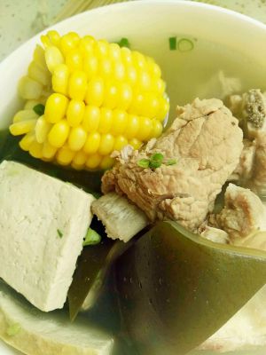 排骨炖熟后,加入玉米,海带,豆腐,继续炖煮半小时。