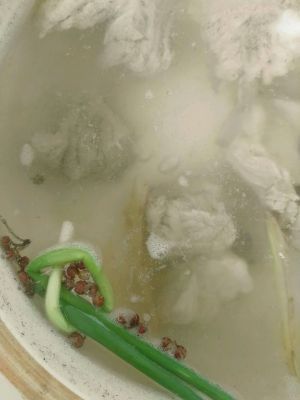 将花椒,葱,姜放入撇了浮沫的烫里,关小火,盖锅盖,炖煮1小时。