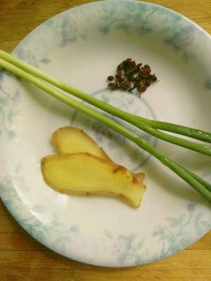 准备两片姜,小葱两根,花椒数粒,清洗干净。